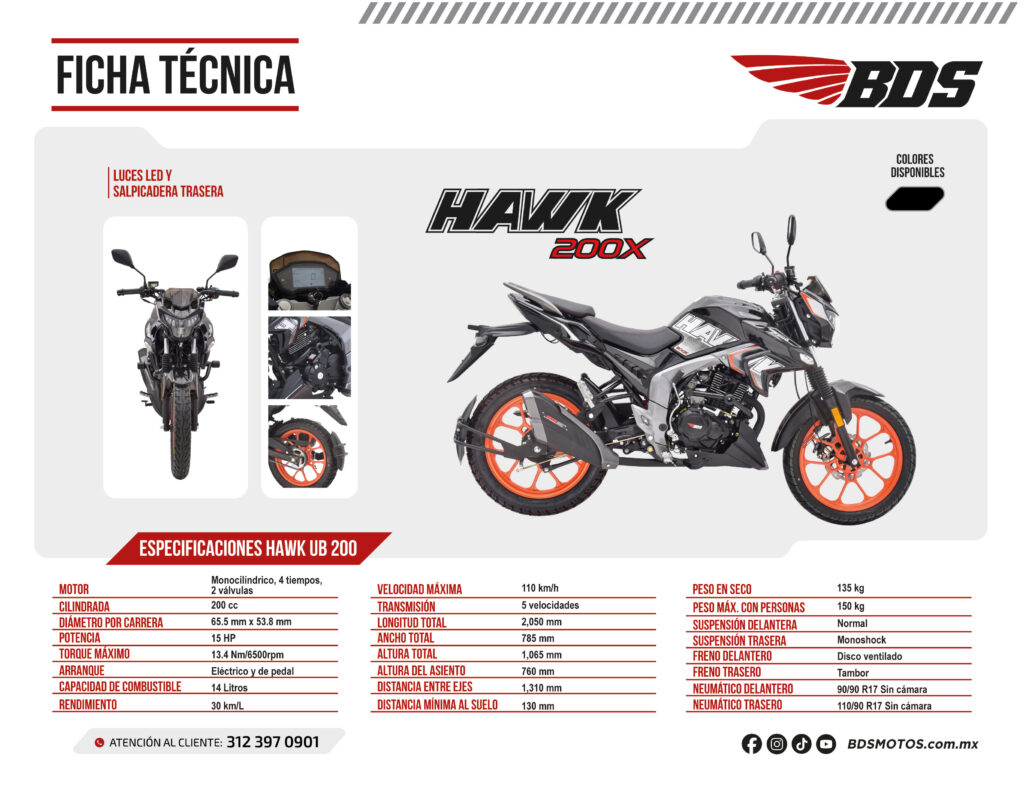 La Hawk 200, con un motor de 200 cc, combina potencia y eficiencia para un rendimiento óptimo en entornos urbanos. Su motor monocilíndrico de 4 tiempos y 2 válvulas ofrece 15 hp y un torque de 13.4 Nm a 6500 rpm, garantizando una conducción fiable. Con un chasis compacto y ligero, esta moto es fácil de maniobrar. Su capacidad de combustible de 14 litros y un rendimiento de 30 km/l proporcionan excelente autonomía. Ofrece arranque eléctrico y de pedal, además de una transmisión de 5 velocidades que permite alcanzar una velocidad máxima de 110 km/h. Sus dimensiones de 2050 mm de largo, 785 mm de ancho y 1065 mm de alto aseguran una postura cómoda. La Hawk 200 es la compañera perfecta para quienes buscan fiabilidad y versatilidad en el uso diario.