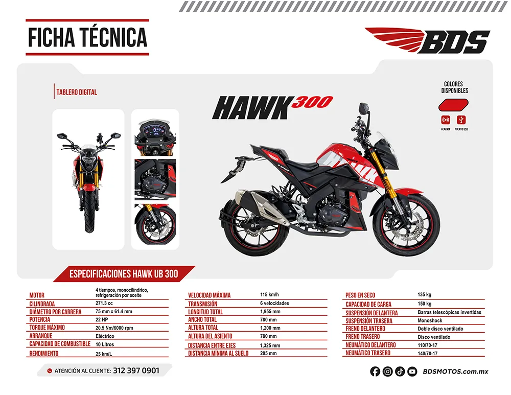 Diseñada para dominar el entorno urbano, la Hawk 300 combina rendimiento, agilidad y diseño moderno. Equipada con un motor monocilíndrico de 4 tiempos, ofrece una potencia de 22 HP y un torque máximo de 20.5 N·m a 6000 rpm, lo que garantiza una conducción dinámica y eficiente en cada trayecto.