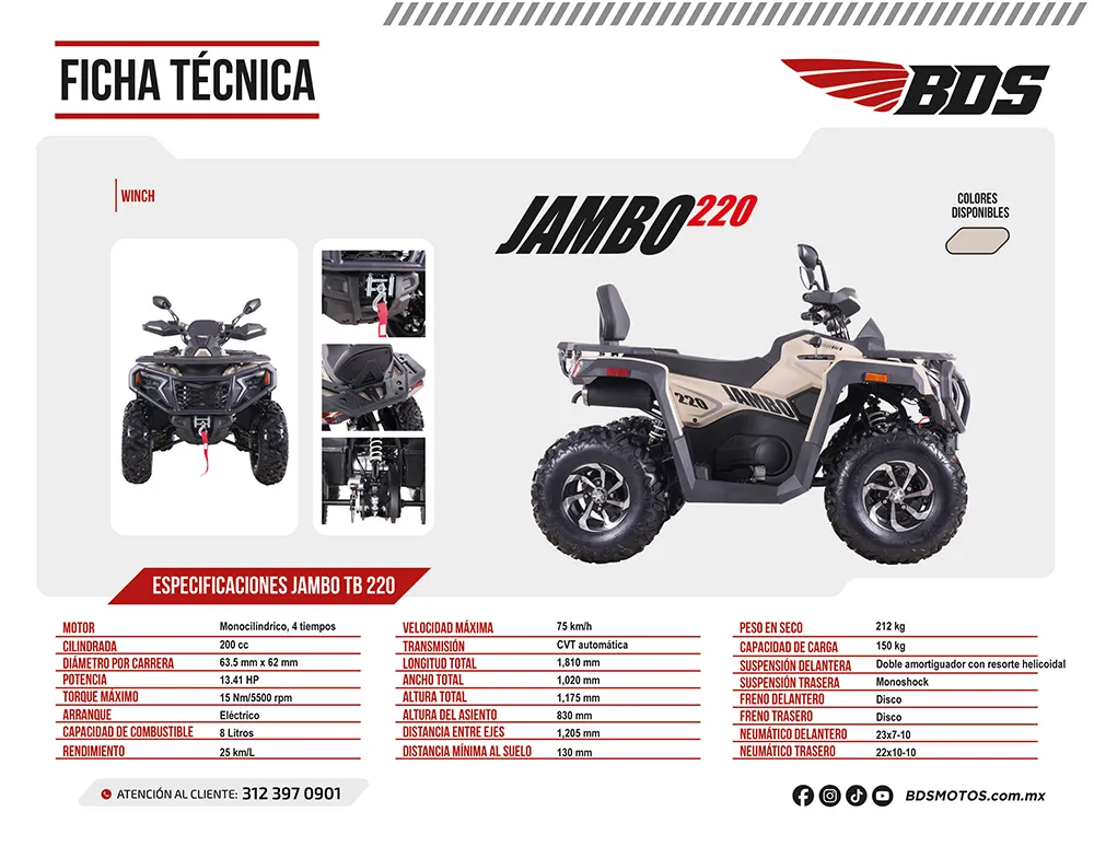 Su potencia de 13.41 HP y su velocidad máxima de 75 km/h te brindan el equilibrio perfecto entre desempeño y seguridad. Además, gracias a su tanque de 8 litros, disfrutarás de una excelente autonomía para que tus trayectos sean más largos y sin preocupaciones. La Jambo 220 combina versatilidad, durabilidad y un estilo pensado para acompañarte en cada aventura.