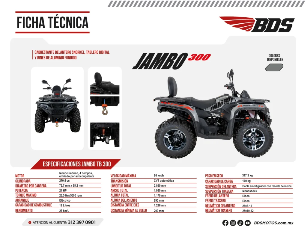 Esta Jambo 300 es una excelente opción para aquellos que buscan una cuatrimoto potente y versátil, capaz de enfrentar terrenos difíciles y ofrecer una experiencia de conducción emocionante. Con transmisión automática, arranque eléctrico y una velocidad máxima de 82 km/h, te brinda control y facilidad de manejo. Su tanque de 14 L y rendimiento de 23 km/L aseguran trayectos prolongados sin preocupaciones. Además, incorpora detalles que marcan la diferencia: cabrestante delantero, ruedas de aluminio fundido y tablero digital.