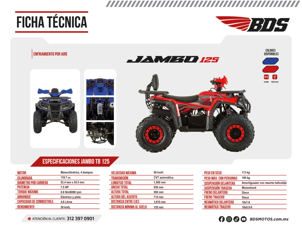 La Jambo 125 es una cuatrimoto diseñada para aventuras ligeras, combinando eficiencia y facilidad de uso. Equipado con un motor monocilíndrico de 4 tiempos y un cilindraje de 119.7 cc, ofrece una potencia de 7.5 HP, lo que la hace ideal para recorridos tranquilos. Con un arranque eléctrico y de pedal, esta cuatrimoto asegura una experiencia de conducción conveniente en cualquier momento.