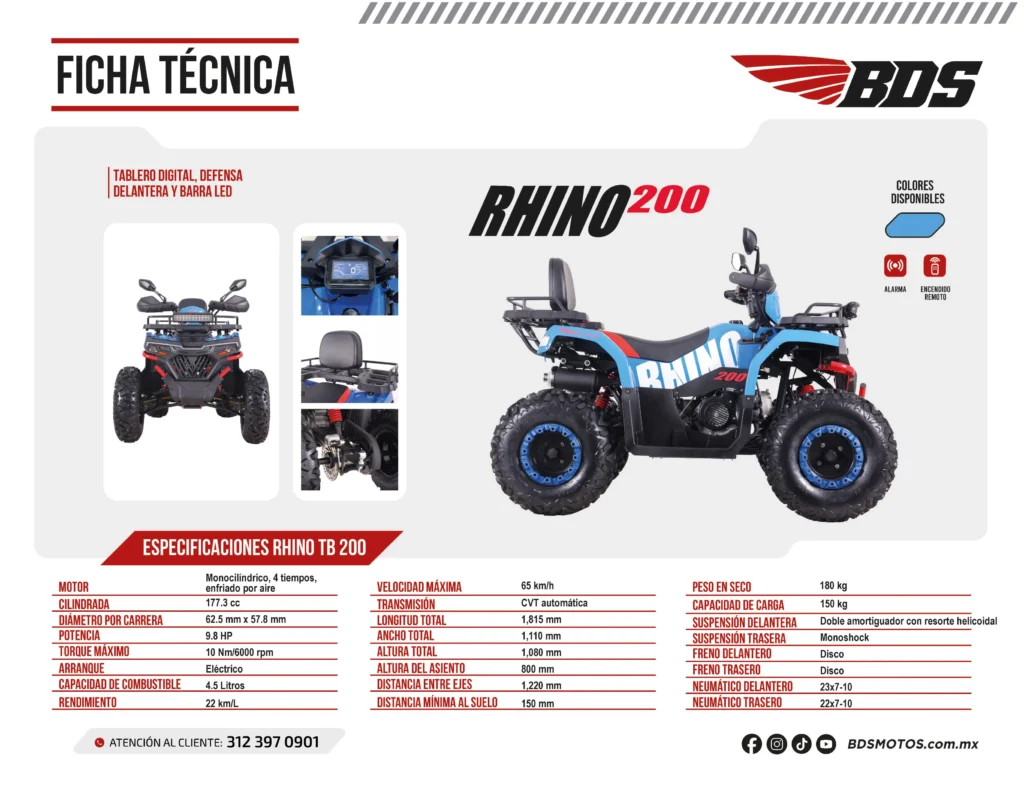 La Rhino 200 fuerza y versatilidad, ideal para recorrer cualquier camino con seguridad y confort.