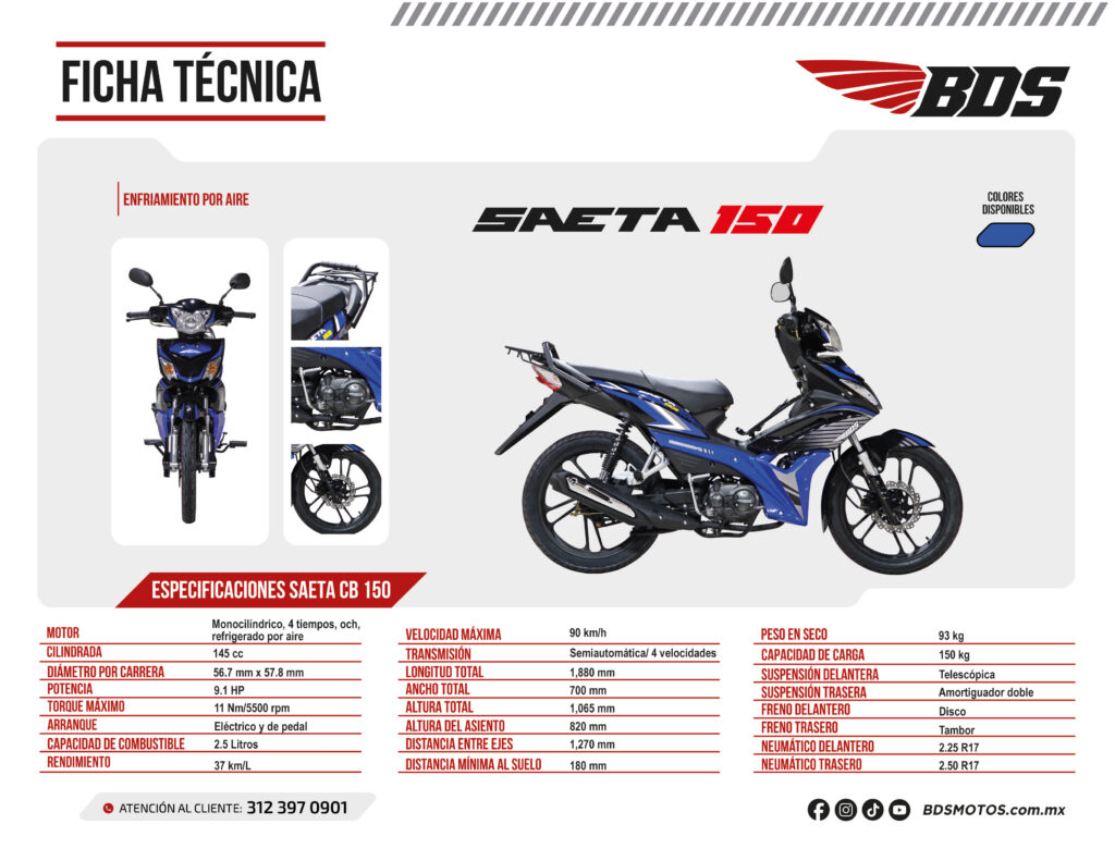 Con una capacidad de combustible de 2.5 litros y un rendimiento de 37 kilómetros por litro, la Saeta CB 150 es perfecta para trayectos diarios, asegurando un bajo consumo de combustible. Puede alcanzar una velocidad máxima de 90 km/h, lo que la convierte en una opción segura y confiable para el uso urbano. Su transmisión semiautomática de 4 velocidades permite una conducción fluida y sin complicaciones.