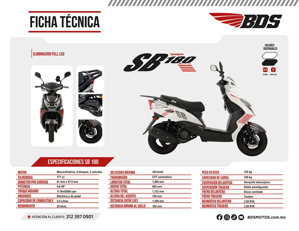 La SB 180 es una motoneta diseñada para ofrecer comodidad, eficiencia y estilo en cada trayecto. Equipada con un motor de 180 cc y transmisión automática CVT, brinda una conducción suave y sin esfuerzo, ideal para quienes buscan practicidad en la ciudad. Su arranque eléctrico y de pedal facilita el uso diario, mientras que su velocidad máxima de 105 km/h y capacidad de carga de hasta 150 kg la hacen perfecta para desplazamientos personales o laborales. Con un diseño compacto, peso ligero de 105 kg y altura de asiento de 750 mm, es fácil de maniobrar incluso en espacios reducidos. Su tanque de 5.5 litros proporciona buena autonomía para el día a día. La SB 180 es la aliada ideal para quienes valoran funcionalidad, agilidad y confort.