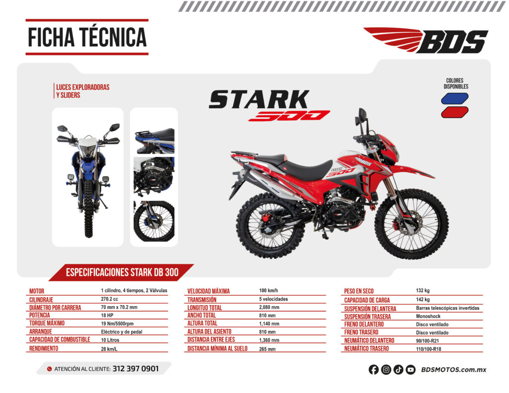 La Stark 300 es una moto de doble propósito diseñada para quienes buscan versatilidad y potencia. Con un motor de 1 cilindro, 4 tiempos y 2 válvulas, y una potencia de 18 HP, esta moto ofrece un rendimiento sólido en todo tipo de terrenos. Su arranque eléctrico y de pedal asegura conveniencia y fiabilidad, mientras que su capacidad de combustible de 10 litros y rendimiento de 28 km/l permiten viajes prolongados sin problemas. Con una velocidad máxima de 100 km/h y una transmisión de 5 velocidades, la Stark DB 300 está lista para enfrentar tanto rutas urbanas como off-road con facilidad.